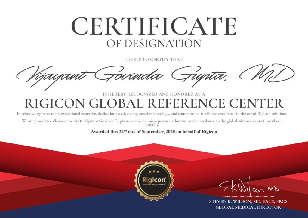 New Delhi Andrology, under the leadership of Dr. Vijayant Govinda Gupta (MD), has been officially designated as a Rigicon® Global Reference Center. This recognition reflects the clinic’s excellence in advanced penile implant surgery, exceptional clinical outcomes, and adherence to international surgical standards. The center is known for combining cutting-edge technology with globally trained expertise.